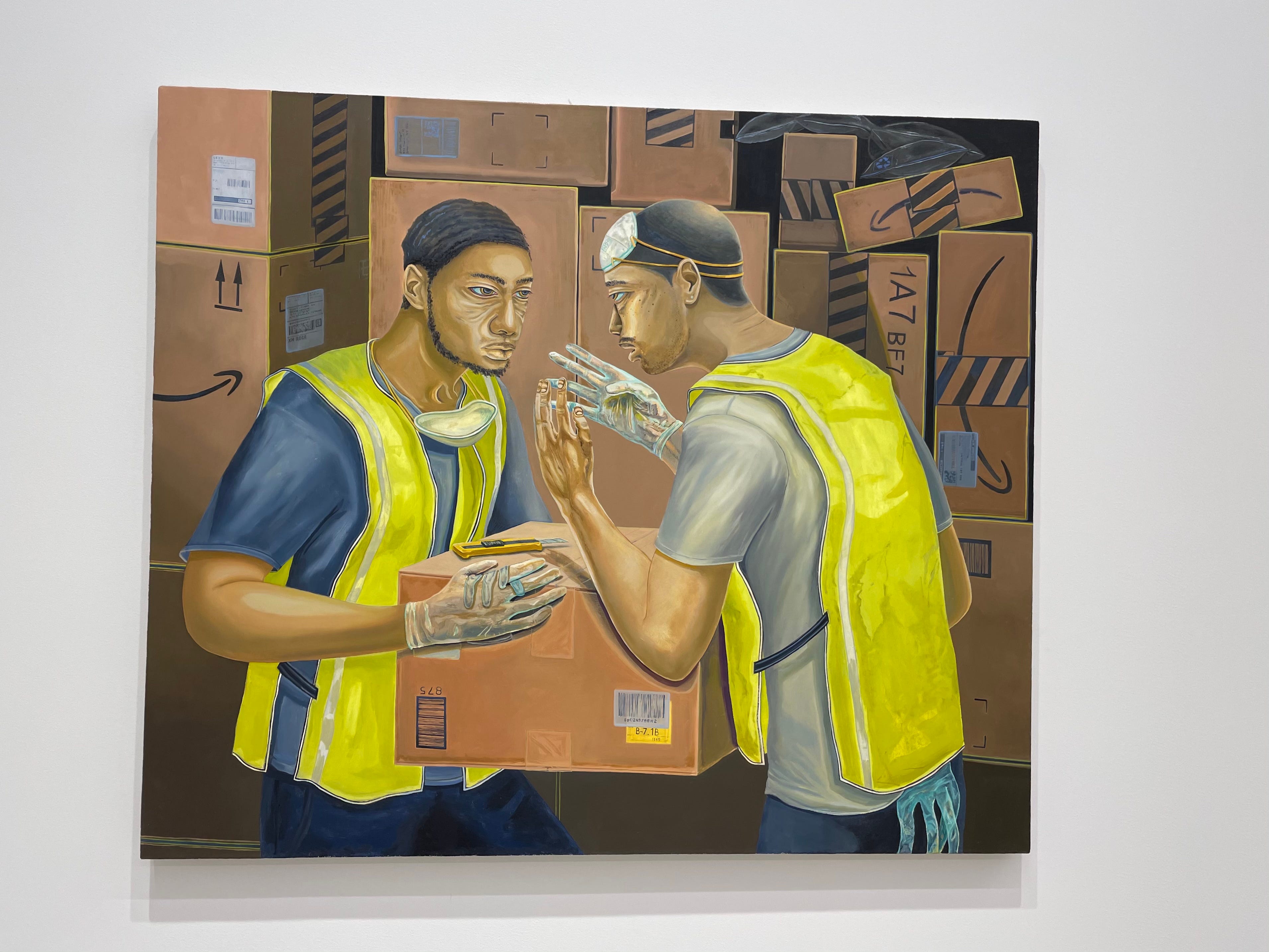 I notice the repeated yellow in their vests and the outline of the boxes behind them.
